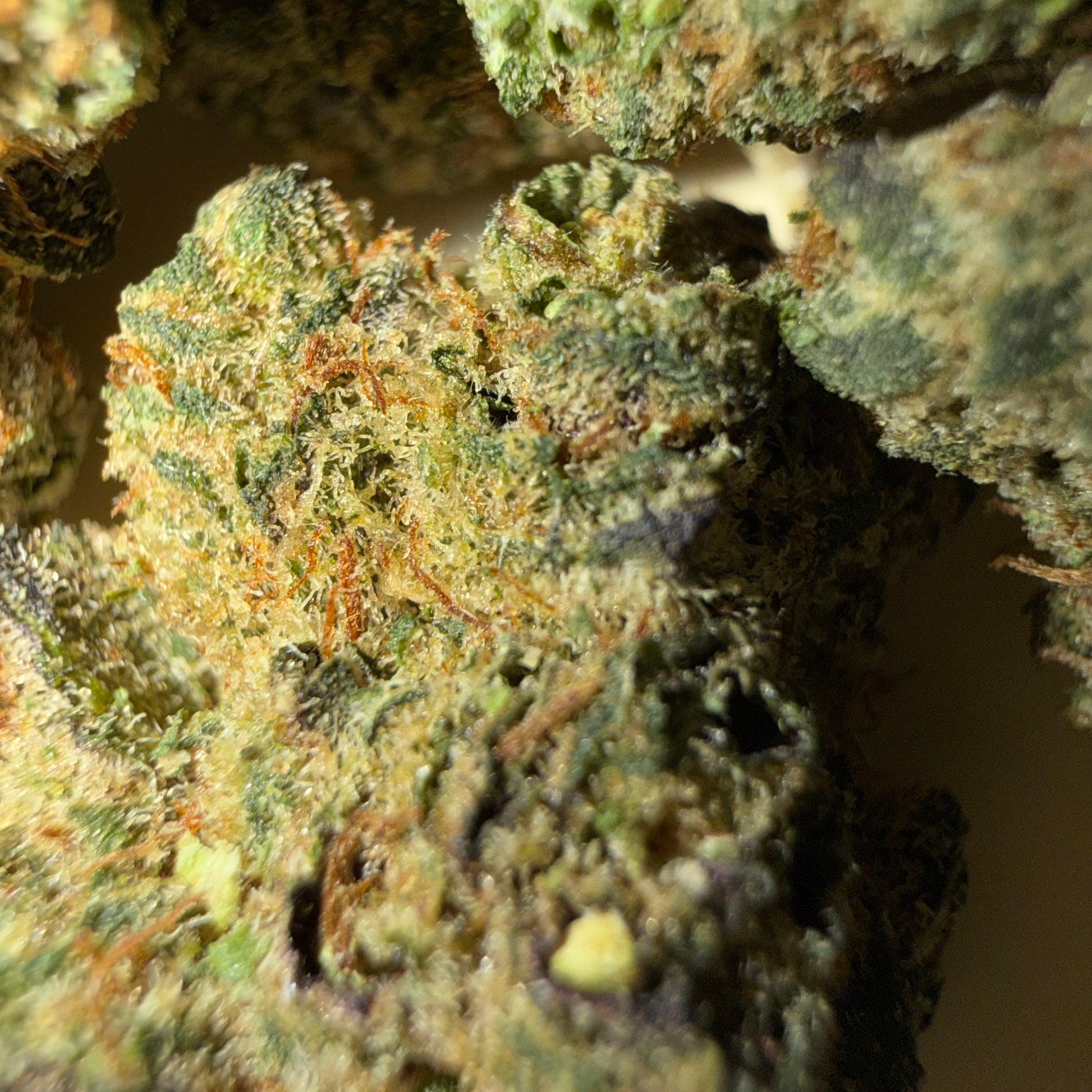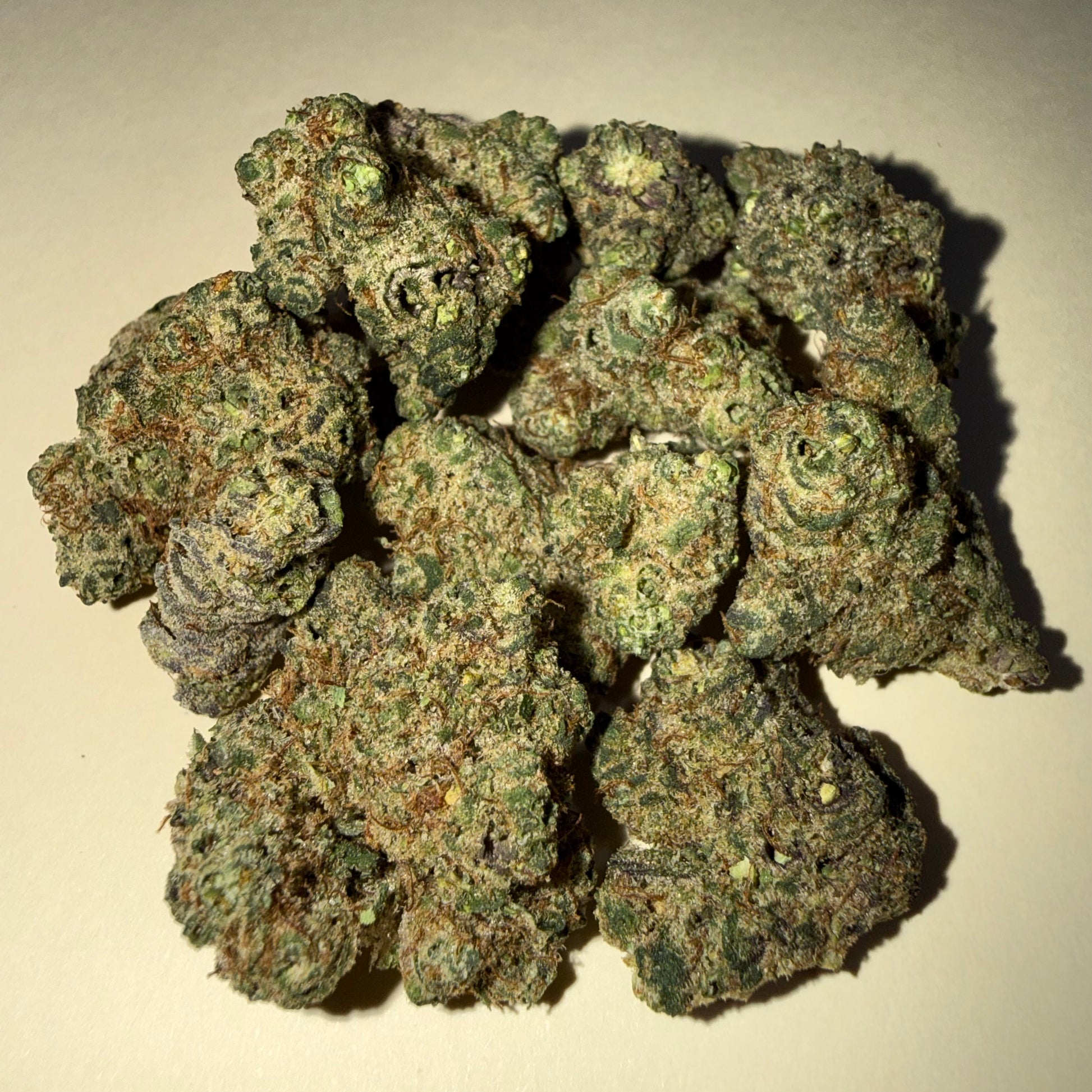 Small buds compactos y bien formados, de tonos verdes con matices más oscuros y ligeros reflejos violáceos. Cubiertos de tricomas, presentan una apariencia resinosa y cuidada, típica de un cultivo indoor hydro de calidad.